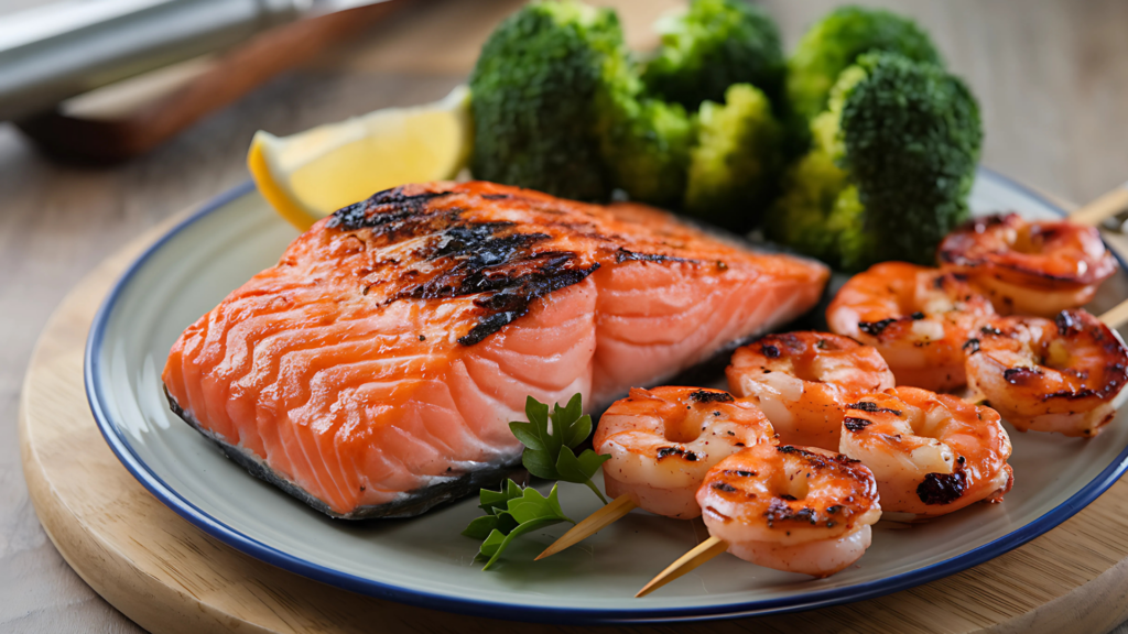 This grilled salmon, shrimp, and broccoli recipe is quick, healthy, and tasty. It’s packed with omega-3 fatty acids and protein, which are good for your heart and might even boost your mental health.