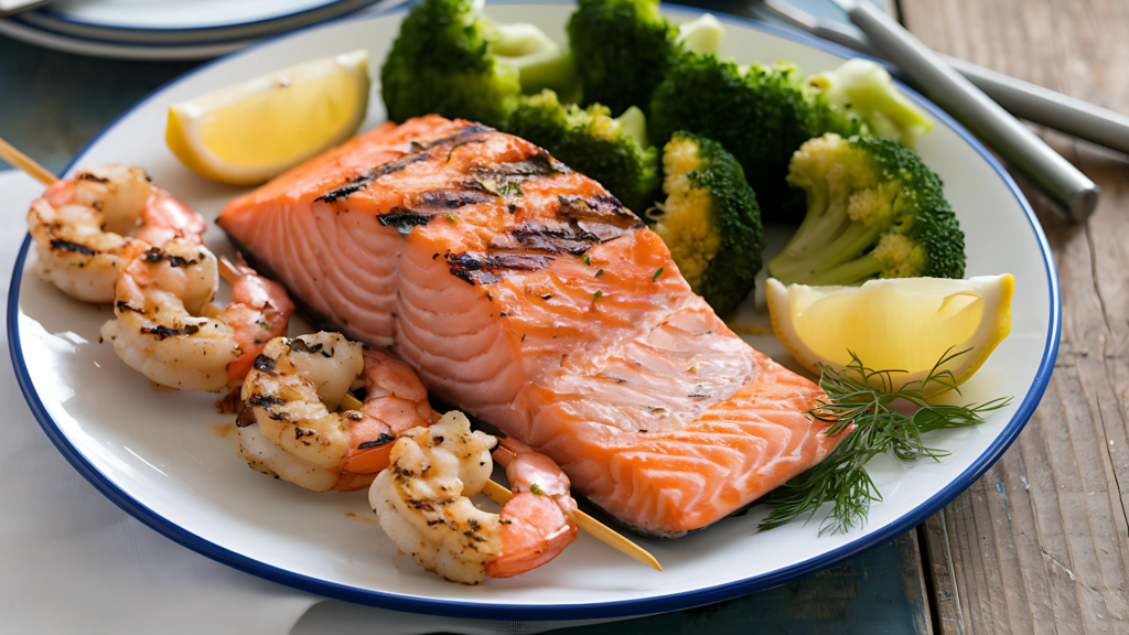 Recipe for grilled salmon, grilled shrimp, and steamed broccoli