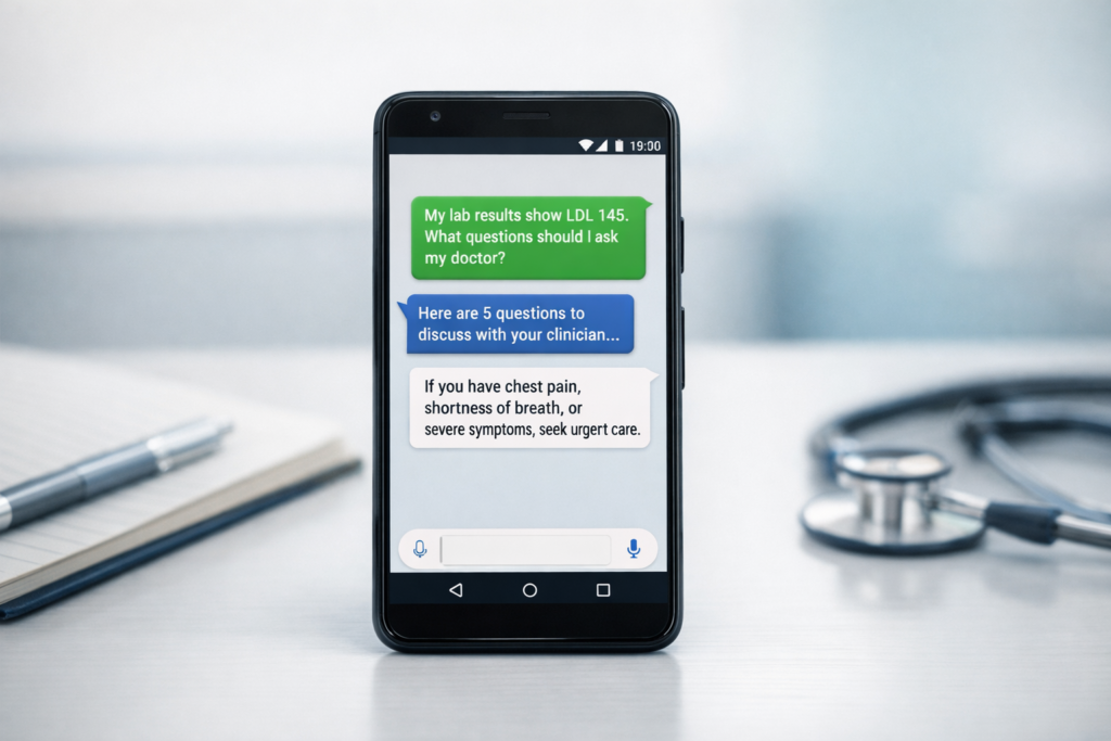 This grounding is the point: it’s not just “what is LDL cholesterol?” It’s “help patients understand their LDL trend over time and what questions to ask clinician.”